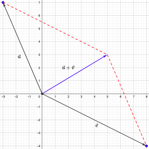 La suma de los vectores \( \overrightarrow{u}=(-3,7)\) y \( \overrightarrow{v}=(8,-4)\), es el vector: \( \overrightarrow{u}+\overrightarrow{v}=(-3+8,7-4)=(5,3)\)